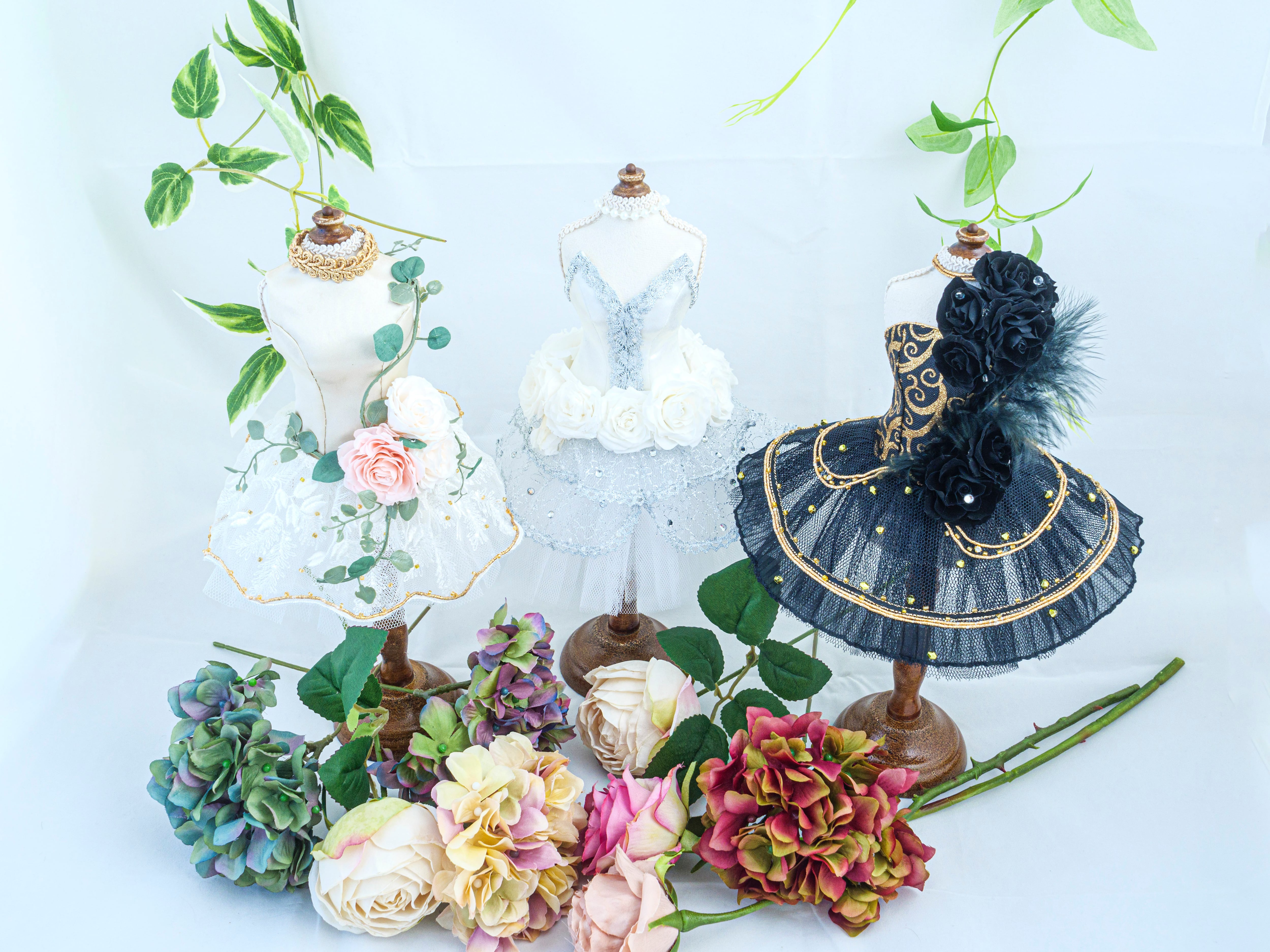 お花(プリザーブドフラワー)をあしらってあるので、観賞用としてご使用ください。ボディからドレスを外すとフォルムやお花が壊れてしまいます。その際は、こちらでは修復しかねますのでご了承ください。このバレエドールで使用されるプリザーブドフラワーは裏面に樹脂を塗布し、布への花の色移りがなく、また花は型崩れしにくく壊れにくい加工を施してあります。
